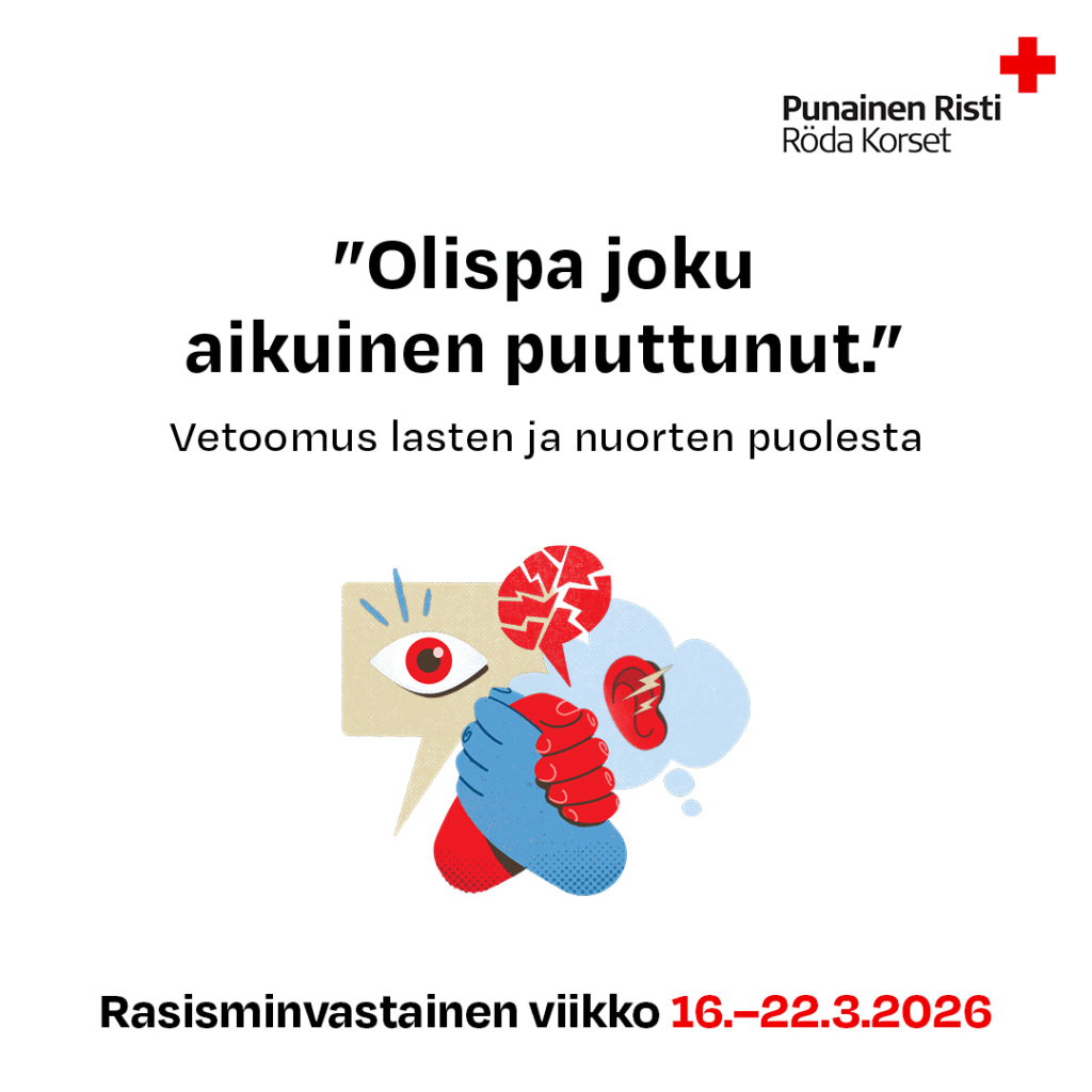 Lue lisää Punaisen ristin tutkimuksesta rasismiin puuttumisesta: Punaisen Ristin tutkimus: Valtaosa Suomessa asuvista kokee rasismin heikentävän yhteiskunnan turvallisuutta – Punainen Risti
